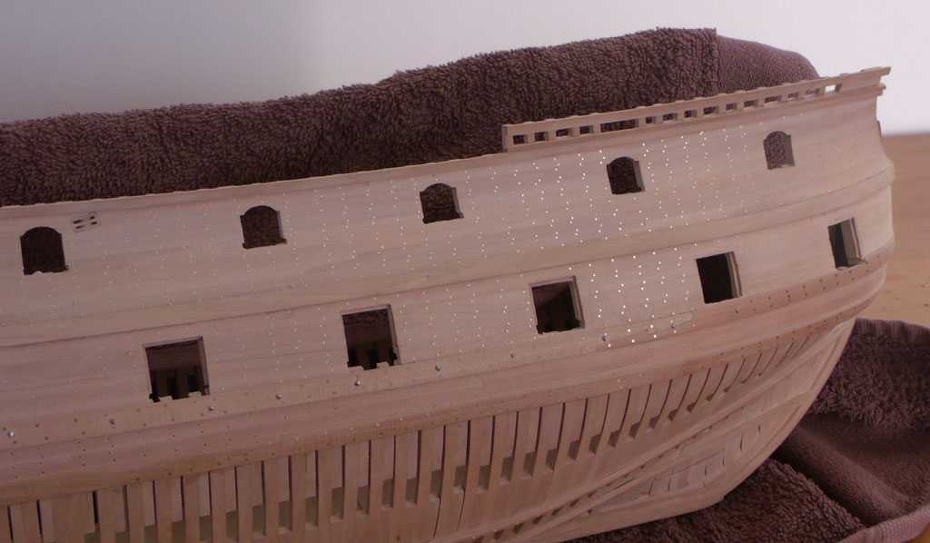 Treenails jest wykonany z pasemka forniru olchowego. od wyrównanej krawędzi odcięty pasek o szerokości około 1 mm po czym przepuszczony przez otworki aż do średnicy 0,6 mm. Zabawy przy tym że hoho. Otwory w pokładzie wywiercone na średnicę mniejszą czyli na 0,5 mm.