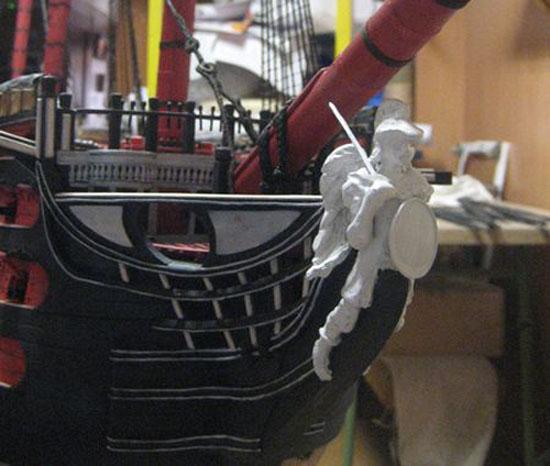 Zdecydowałbym się na zrobienie mojej rufy wg tego rysunku, ale wstrzymuje mnie niedokładność projektu (dla mnie to jest projekt wstępny, koncepcyjny z uproszczeniami, na podstawie którego trzeba dopiero zrobić projekt właściwy - a to dużo szukania płaskorzeźb postaci (modela, modeli) użytych w projekcie wstępnym) i skala. Po zrobieniu całego kadłuba i sekcji być może pokuszę się na zrobienie samej rufy ze złoconą galerią w większej skali
